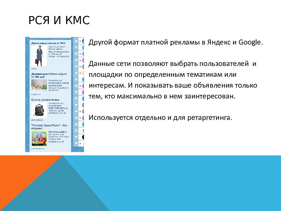 Другой формат платной рекламы в Яндекс и Google. Данные сети позволяют выбрать пользователей и площадки по определенным тематикам или интересам. И показывать ваше объявления только тем, кто максимально в нем заинтересован. Используется отдельно и для ретаргетинга.