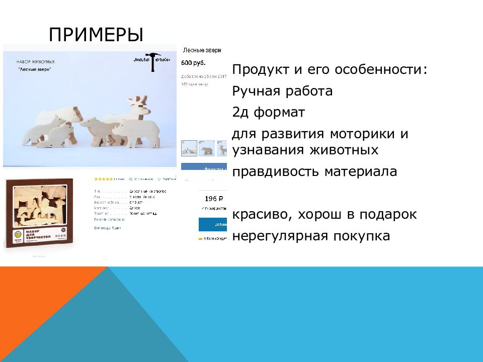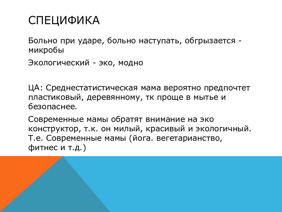 Больно при ударе, больно наступать, обгрызается - микробы Экологический - эко, модно ЦА: Среднестатистическая мама вероятно предпочтет пластиковый, деревянному, тк проще в мытье и безопаснее. Современные мамы обратят внимание на эко конструктор, т.к. он милый, красивый и экологичный. Т.е. Современные мамы (йога. вегетарианство, фитнес и т.д.)