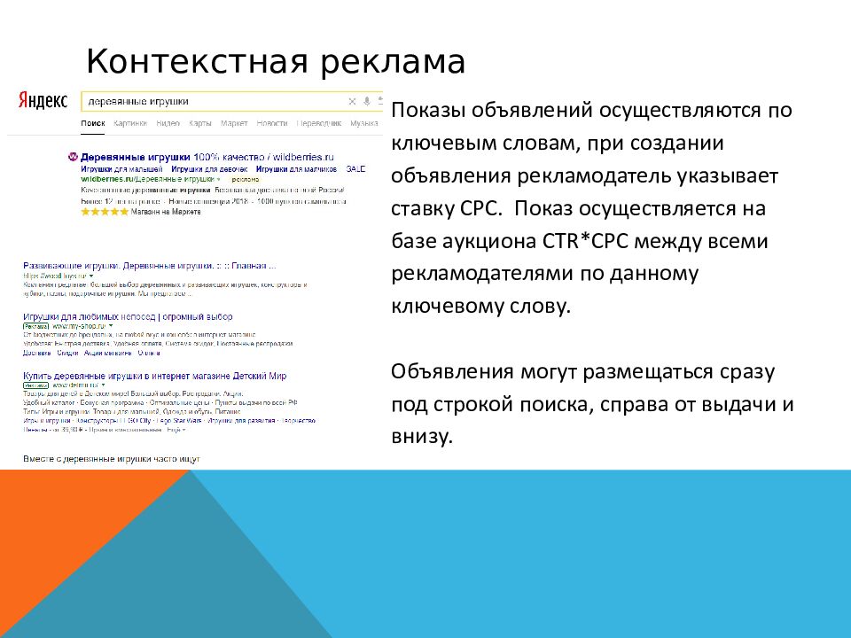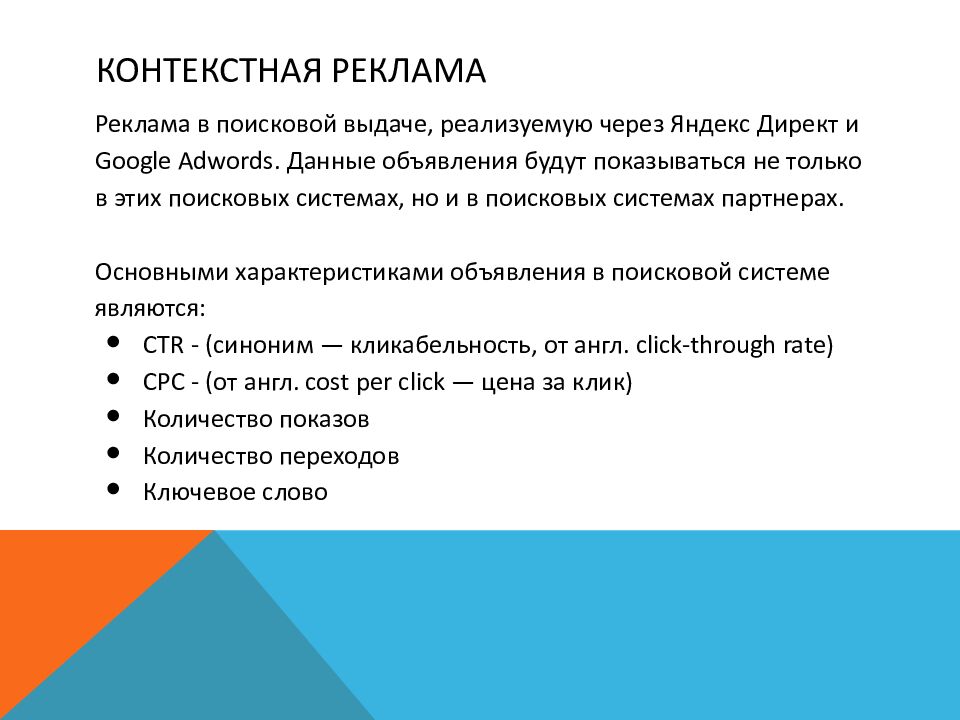 Реклама в поисковой выдаче, реализуемую через Яндекс Директ и Google Adwords. Данные объявления будут показываться не только в этих поисковых системах, но и в поисковых системах партнерах. Основными характеристиками объявления в поисковой системе являются: CTR - (синоним — кликабельность, от англ. click-through rate) CPC - (от англ. cost per click — цена за клик) Количество показов Количество переходов Ключевое слово