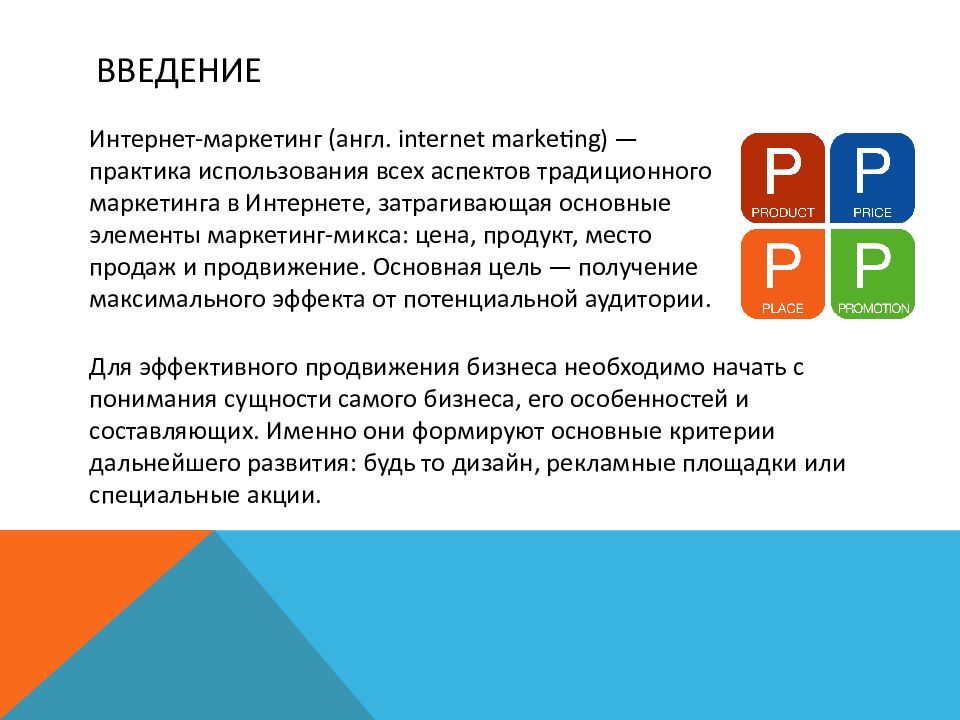Интернет-маркетинг (англ. internet marketing) — практика использования всех аспектов традиционного маркетинга в Интернете, затрагивающая основные элементы маркетинг-микса: цена, продукт, место продаж и продвижение. Основная цель — получение максимального эффекта от потенциальной аудитории. Для эффективного продвижения бизнеса необходимо начать с понимания сущности самого бизнеса, его особенностей и составляющих. Именно они формируют основные критерии дальнейшего развития: будь то дизайн, рекламные площадки или специальные акции.