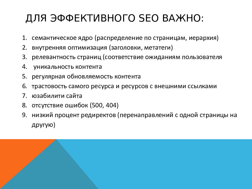 семантическое ядро (распределение по страницам, иерархия) внутренняя оптимизация (заголовки, метатеги) релевантность страниц (соответствие ожиданиям пользователя уникальность контента регулярная обновляемость контента трастовость самого ресурса и ресурсов с внешними ссылками юзабилити сайта отсутствие ошибок (500, 404) низкий процент редиректов (перенаправлений с одной страницы на другую)
