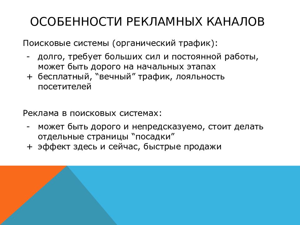 Поисковые системы (органический трафик): долго, требует больших сил и постоянной работы, может быть дорого на начальных этапах бесплатный, “вечный” трафик, лояльность посетителей Реклама в поисковых системах: может быть дорого и непредсказуемо, стоит делать отдельные страницы “посадки” эффект здесь и сейчас, быстрые продажи