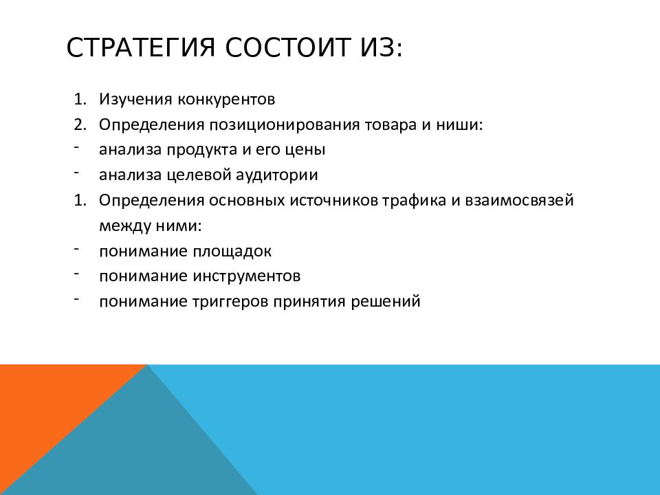 Изучения конкурентов Определения позиционирования товара и ниши: анализа продукта и его цены анализа целевой аудитории Определения основных источников трафика и взаимосвязей между ними: понимание площадок понимание инструментов понимание триггеров принятия решений