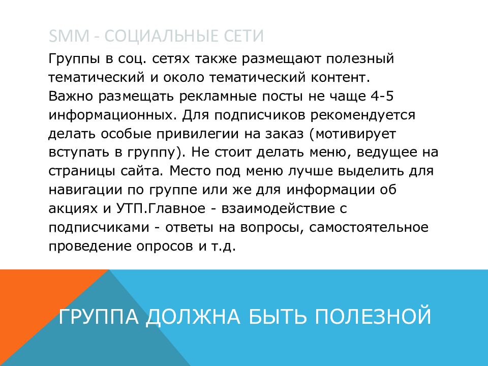 Группы в соц. сетях также размещают полезный тематический и около тематический контент. Важно размещать рекламные посты не чаще 4-5 информационных. Для подписчиков рекомендуется делать особые привилегии на заказ (мотивирует вступать в группу). Не стоит делать меню, ведущее на страницы сайта. Место под меню лучше выделить для навигации по группе или же для информации об акциях и УТП.Главное - взаимодействие с подписчиками - ответы на вопросы, самостоятельное проведение опросов и т.д. ГРУППА ДОЛЖНА БЫТЬ ПОЛЕЗНОЙ