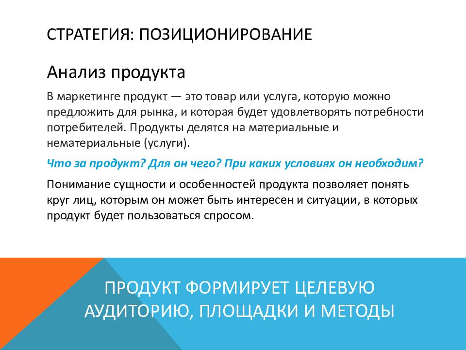 Анализ продукта В маркетинге продукт — это товар или услуга, которую можно предложить для рынка, и которая будет удовлетворять потребности потребителей. Продукты делятся на материальные и нематериальные (услуги). Что за продукт? Для он чего? При каких условиях он необходим? Понимание сущности и особенностей продукта позволяет понять круг лиц, которым он может быть интересен и ситуации, в которых продукт будет пользоваться спросом. ПРОДУКТ ФОРМИРУЕТ ЦЕЛЕВУЮ АУДИТОРИЮ, ПЛОЩАДКИ И МЕТОДЫ