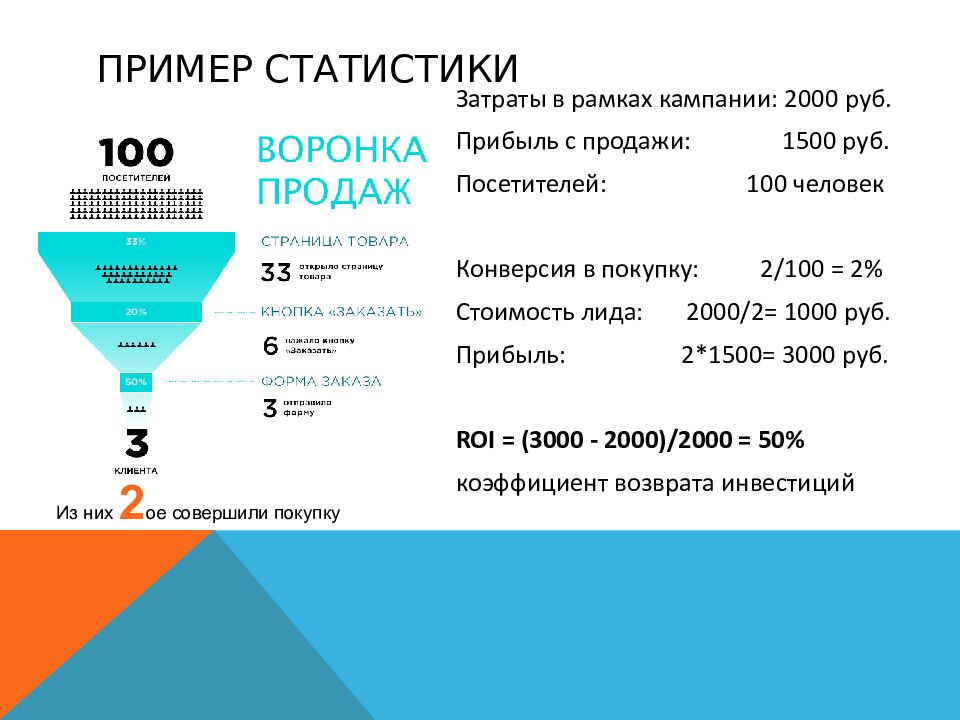 Затраты в рамках кампании: 2000 руб. Прибыль с продажи: 1500 руб. Посетителей: 100 человек Конверсия в покупку: 2/100 = 2% Стоимость лида: 2000/2= 1000 руб. Прибыль: 2*1500= 3000 руб. ROI = (3000 - 2000)/2000 = 50% коэффициент возврата инвестиций Из них 2 ое совершили покупку