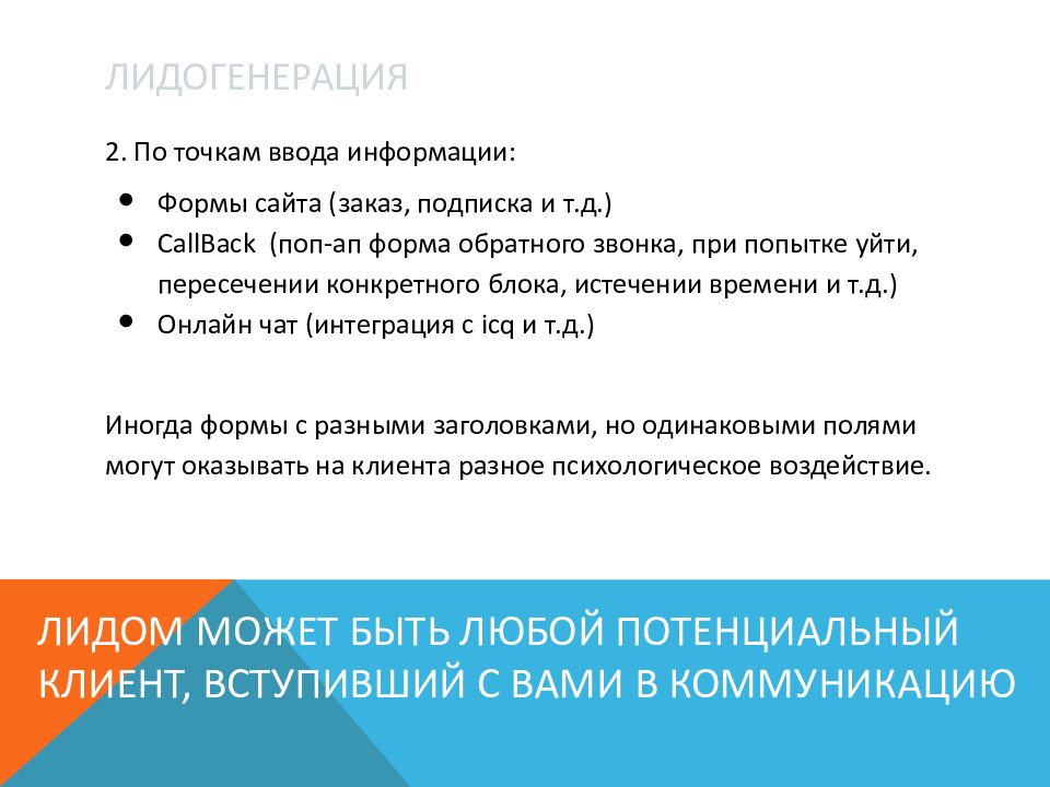 2. По точкам ввода информации: Формы сайта (заказ, подписка и т.д.) CallBack (поп-ап форма обратного звонка, при попытке уйти, пересечении конкретного блока, истечении времени и т.д.) Онлайн чат (интеграция с icq и т.д.) Иногда формы с разными заголовками, но одинаковыми полями могут оказывать на клиента разное психологическое воздействие. ЛИДОМ МОЖЕТ БЫТЬ ЛЮБОЙ ПОТЕНЦИАЛЬНЫЙ КЛИЕНТ, ВСТУПИВШИЙ С ВАМИ В КОММУНИКАЦИЮ