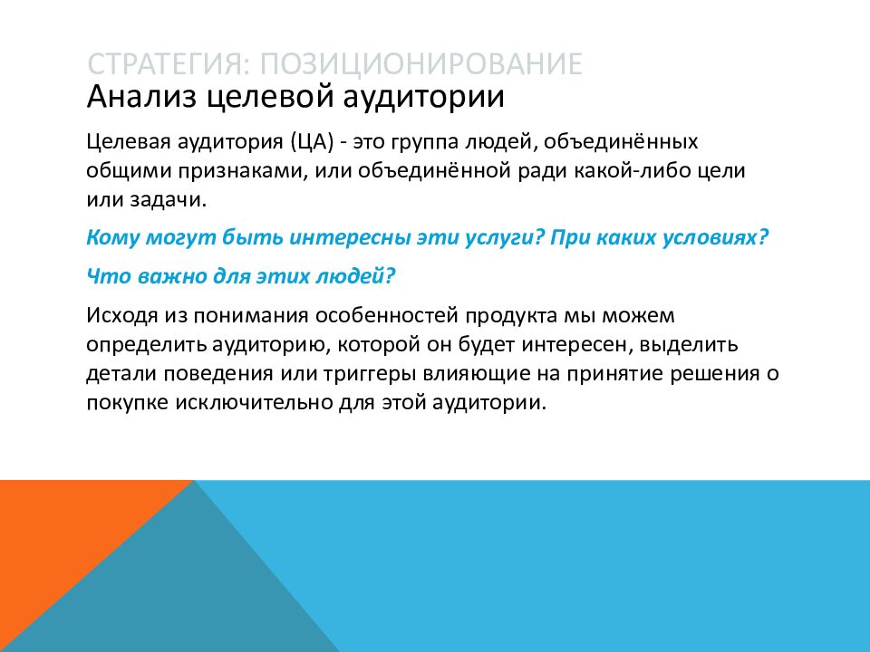 Анализ целевой аудитории Целевая аудитория (ЦА) - это группа людей, объединённых общими признаками, или объединённой ради какой-либо цели или задачи. Кому могут быть интересны эти услуги? При каких условиях? Что важно для этих людей? Исходя из понимания особенностей продукта мы можем определить аудиторию, которой он будет интересен, выделить детали поведения или триггеры влияющие на принятие решения о покупке исключительно для этой аудитории.