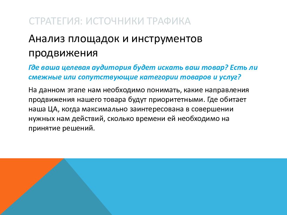 Анализ площадок и инструментов продвижения Где ваша целевая аудитория будет искать ваш товар? Есть ли смежные или сопутствующие категории товаров и услуг? На данном этапе нам необходимо понимать, какие направления продвижения нашего товара будут приоритетными. Где обитает наша ЦА, когда максимально заинтересована в совершении нужных нам действий, сколько времени ей необходимо на принятие решений.