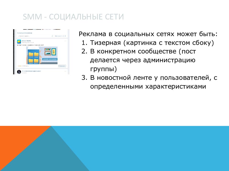 Реклама в социальных сетях может быть: Тизерная (картинка с текстом сбоку) В конкретном сообществе (пост делается через администрацию группы) В новостной ленте у пользователей, с определенными характеристиками