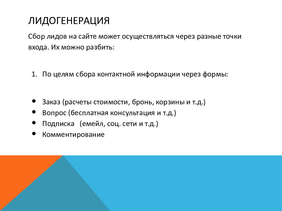 Сбор лидов на сайте может осуществляться через разные точки входа. Их можно разбить: По целям сбора контактной информации через формы: Заказ (расчеты стоимости, бронь, корзины и т.д.) Вопрос (бесплатная консультация и т.д.) Подписка (емейл, соц. сети и т.д.) Комментирование