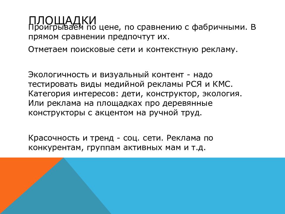 Проигрываем по цене, по сравнению с фабричными. В прямом сравнении предпочтут их. Отметаем поисковые сети и контекстную рекламу. Экологичность и визуальный контент - надо тестировать виды медийной рекламы РСЯ и КМС. Категория интересов: дети, конструктор, экология. Или реклама на площадках про деревянные конструкторы с акцентом на ручной труд. Красочность и тренд - соц. сети. Реклама по конкурентам, группам активных мам и т.д.