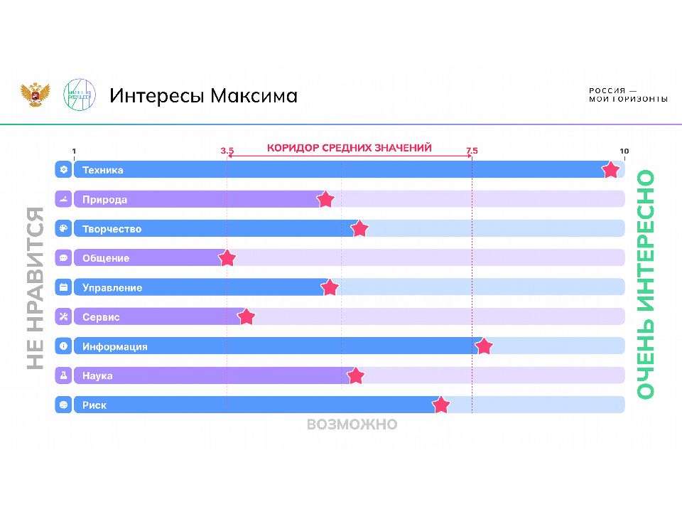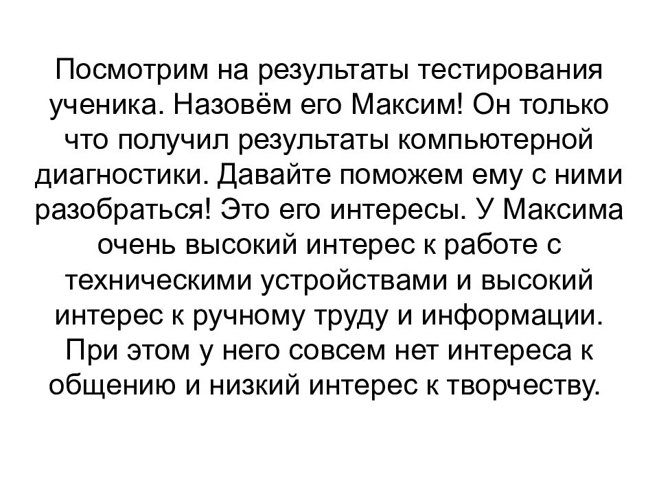 Посмотрим на результаты тестирования ученика. Назовём его Максим! Он только что получил результаты компьютерной диагностики. Давайте поможем ему с ними разобраться! Это его интересы. У Максима очень высокий интерес к работе с техническими устройствами и высокий интерес к ручному труду и информации. При этом у него совсем нет интереса к общению и низкий интерес к творчеству.