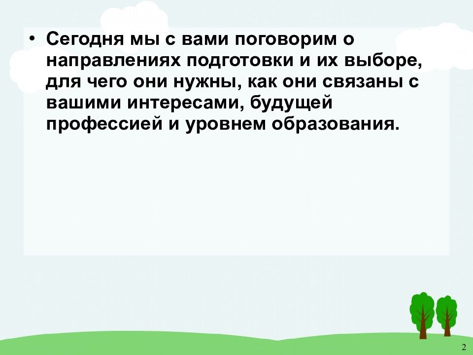 Сегодня мы с вами поговорим о направлениях подготовки и их выборе, для чего они нужны, как они связаны с вашими интересами, будущей профессией и уровнем образования. 2