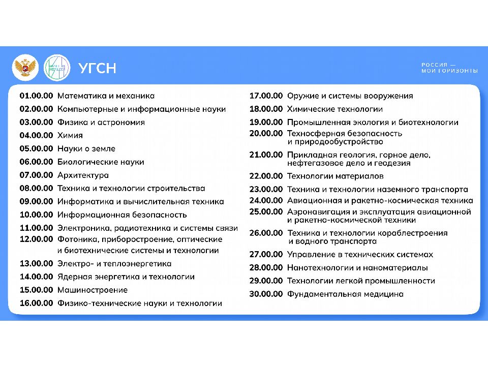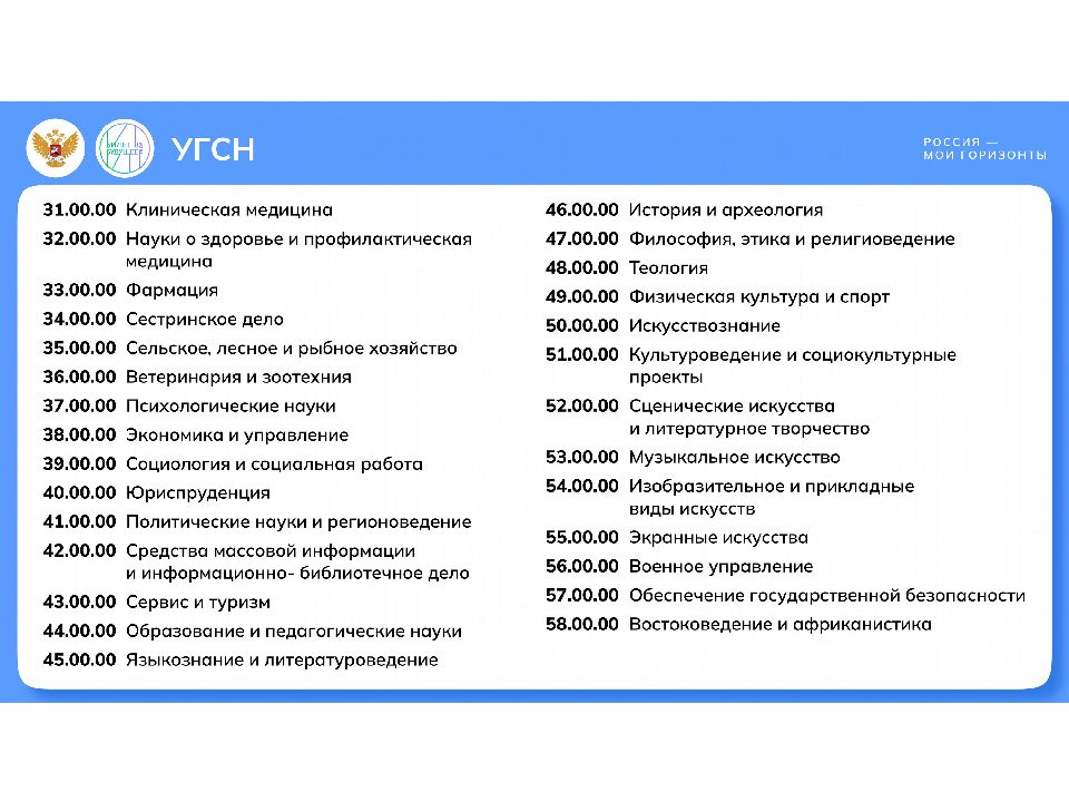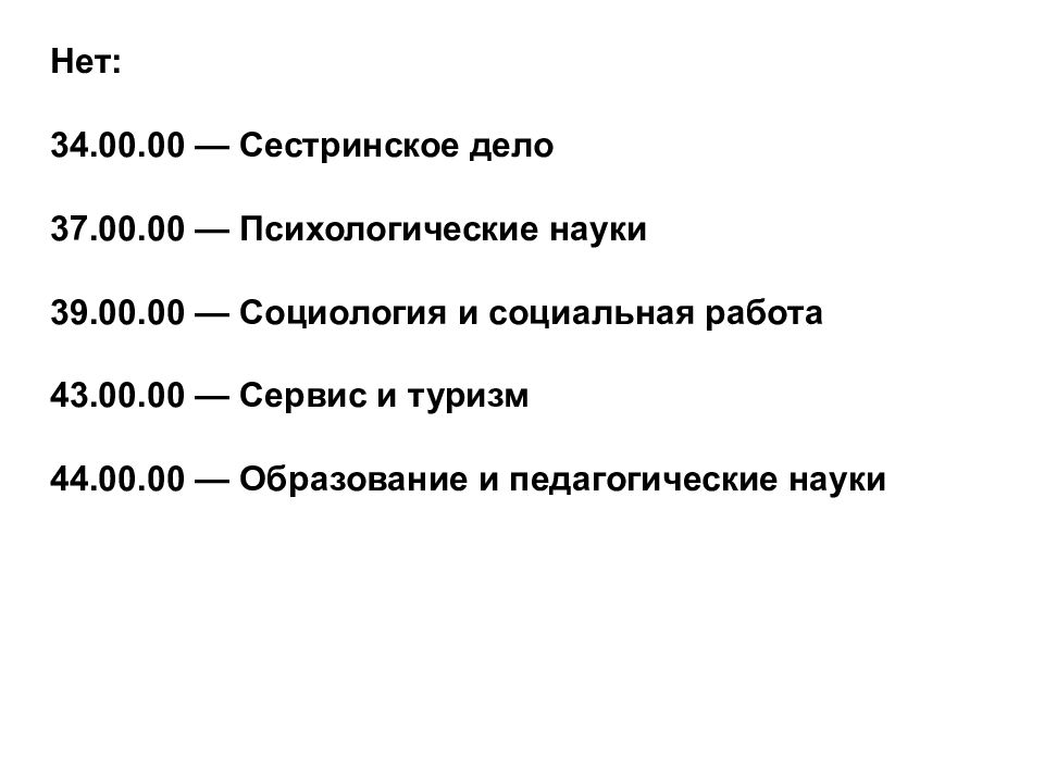 Нет: 34.00.00 — Сестринское дело 37.00.00 — Психологические науки 39.00.00 — Социология и социальная работа 43.00.00 — Сервис и туризм 44.00.00 — Образование и педагогические науки