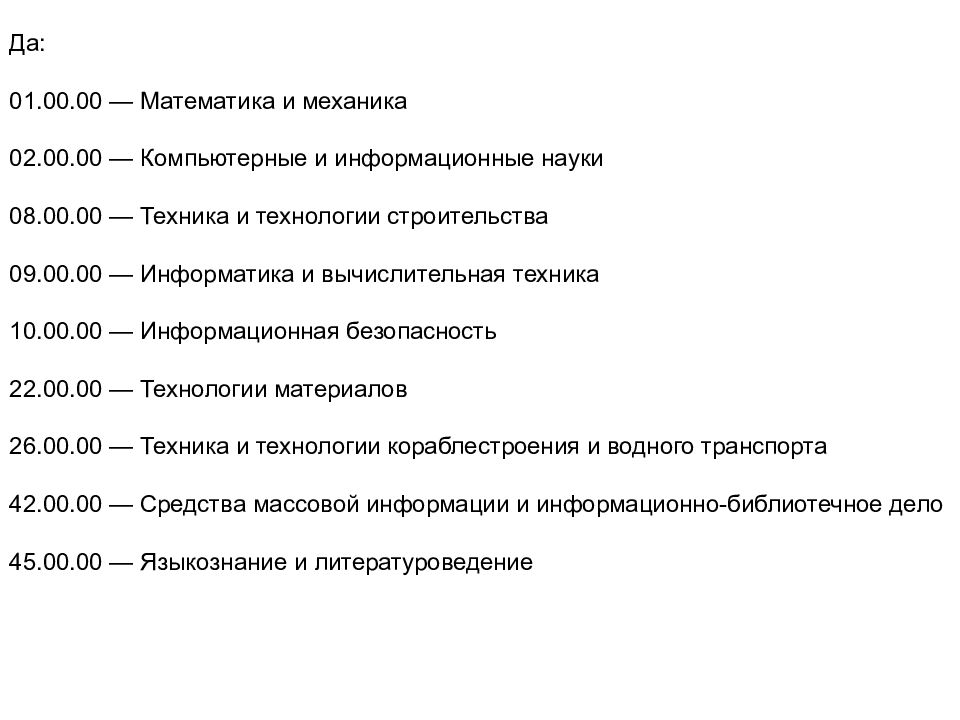 Да: 01.00.00 — Математика и механика 02.00.00 — Компьютерные и информационные науки 08.00.00 — Техника и технологии строительства 09.00.00 — Информатика и вычислительная техника 10.00.00 — Информационная безопасность 22.00.00 — Технологии материалов 26.00.00 — Техника и технологии кораблестроения и водного транспорта 42.00.00 — Средства массовой информации и информационно-библиотечное дело 45.00.00 — Языкознание и литературоведение