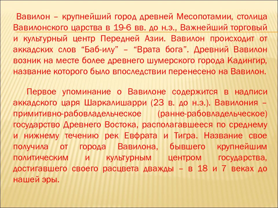 Вавилон – крупнейший город древней Месопотамии, столица Вавилонского царства в 19-6 вв. до н.э., Важнейший торговый и культурный центр Передней Азии. Вавилон происходит от аккадских слов “ Баб-илу ” – “Врата бога”. Древний Вавилон возник на месте более древнего шумерского города Кадингир, название которого было впоследствии перенесено на Вавилон. Первое упоминание о Вавилоне содержится в надписи аккадского царя Шаркалишарри (23 в. до н.э.). Вавилония – примитивно-рабовладельческое ( ранне-рабовладельческое ) государство Древнего Востока, располагавшееся по среднему и нижнему течению рек Евфрата и Тигра. Название свое получила от города Вавилона, бывшего крупнейшим политическим и культурным центром государства, достигавшего своего расцвета дважды – в 18 и 7 веках до нашей эры.