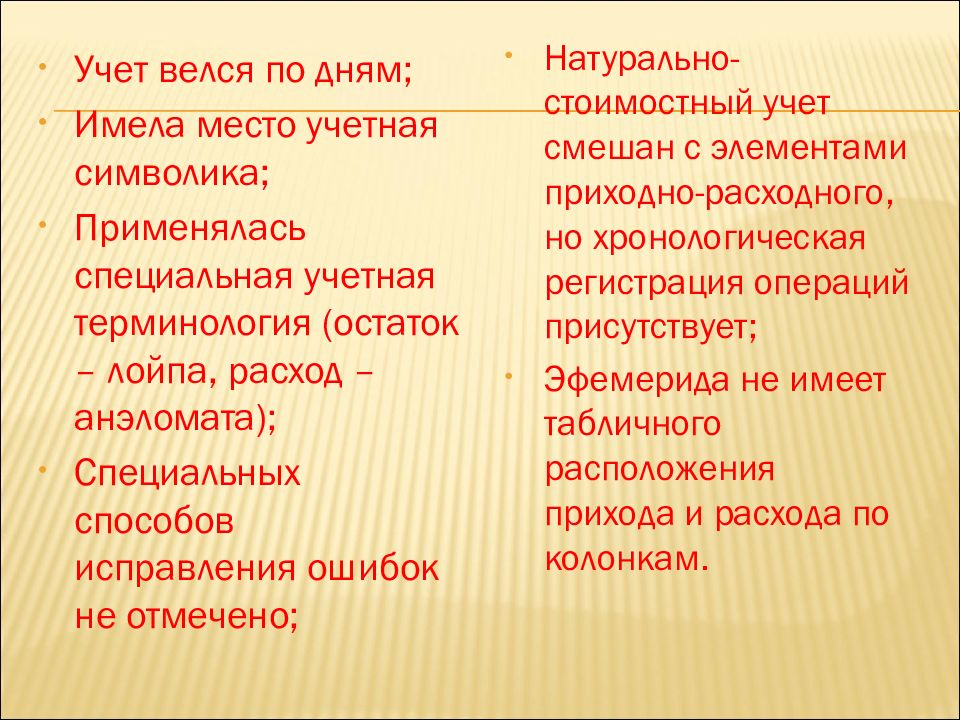 Учет велся по дням; Имела место учетная символика; Применялась специальная учетная терминология (остаток – лойпа, расход – анэломата ); Специальных способов исправления ошибок не отмечено; Натурально-стоимостный учет смешан с элементами приходно-расходного, но хронологическая регистрация операций присутствует; Эфемерида не имеет табличного расположения прихода и расхода по колонкам.