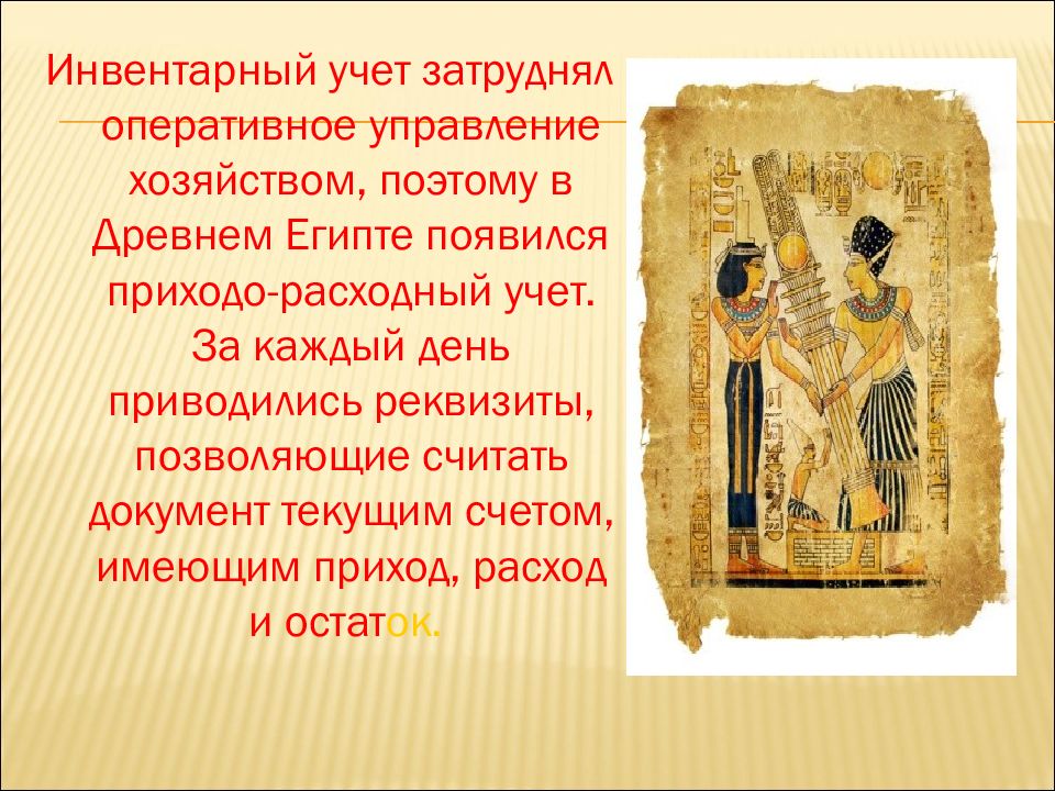 Инвентарный учет затруднял оперативное управление хозяйством, поэтому в Древнем Египте появился приходо-расходный учет. За каждый день приводились реквизиты, позволяющие считать документ текущим счетом, имеющим приход, расход и остат ок.