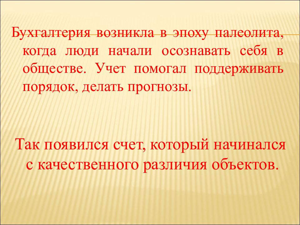 Бухгалтерия возникла в эпоху палеолита, когда люди начали осознавать себя в обществе. Учет помогал поддерживать порядок, делать прогнозы. Так появился счет, который начинался с качественного различия объектов.
