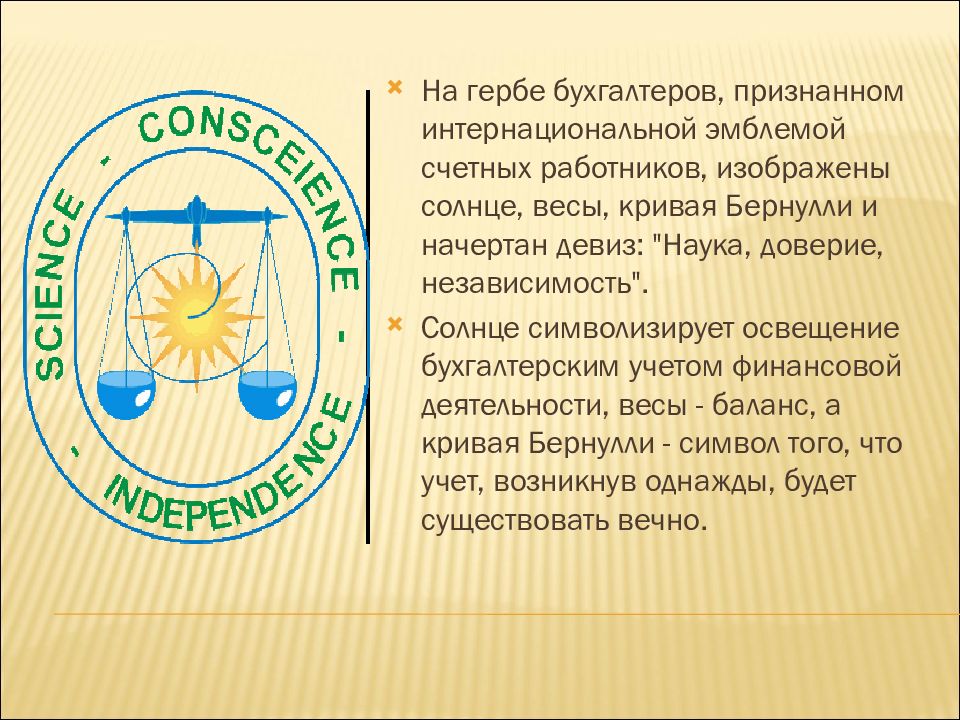 На гербе бухгалтеров, признанном интернациональной эмблемой счетных работников, изображены солнце, весы, кривая Бернулли и начертан девиз: "Наука, доверие, независимость". Солнце символизирует освещение бухгалтерским учетом финансовой деятельности, весы - баланс, а кривая Бернулли - символ того, что учет, возникнув однажды, будет существовать вечно.