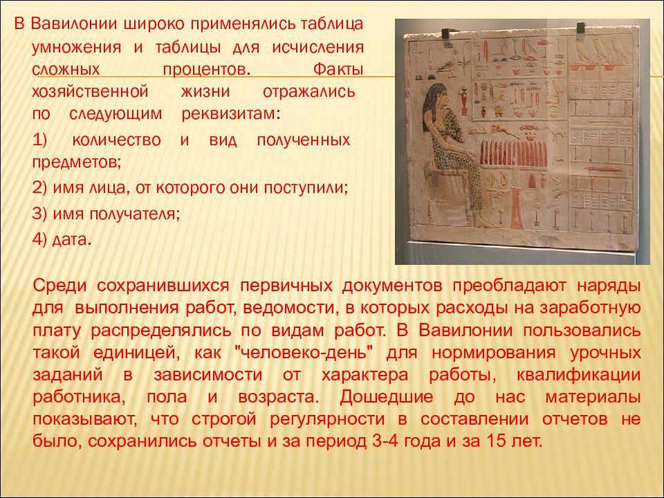 В Вавилонии широко применялись таблица умножения и таблицы для исчисления сложных процентов. Факты хозяйственной жизни отражались по следующим реквизитам: 1) количество и вид полученных предметов; 2) имя лица, от которого они поступили; 3) имя получателя; 4) дата. Среди сохранившихся первичных документов преобладают наряды для выполнения работ, ведомости, в которых расходы на заработную плату распределялись по видам работ. В Вавилонии пользовались такой единицей, как "человеко-день" для нормирования урочных заданий в зависимости от характера работы, квалификации работника, пола и возраста. Дошедшие до нас материалы показывают, что строгой регулярности в составлении отчетов не было, сохранились отчеты и за период 3-4 года и за 15 лет.