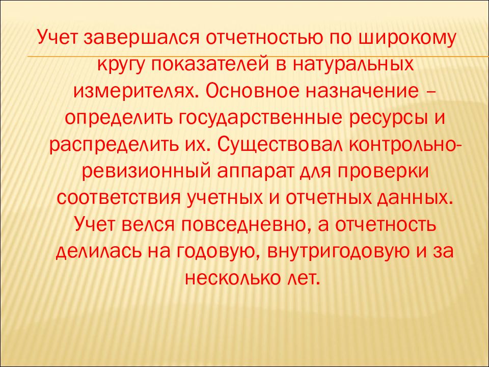 Учет завершался отчетностью по широкому кругу показателей в натуральных измерителях. Основное назначение – определить государственные ресурсы и распределить их. Существовал контрольно-ревизионный аппарат для проверки соответствия учетных и отчетных данных. Учет велся повседневно, а отчетность делилась на годовую, внутригодовую и за несколько лет.