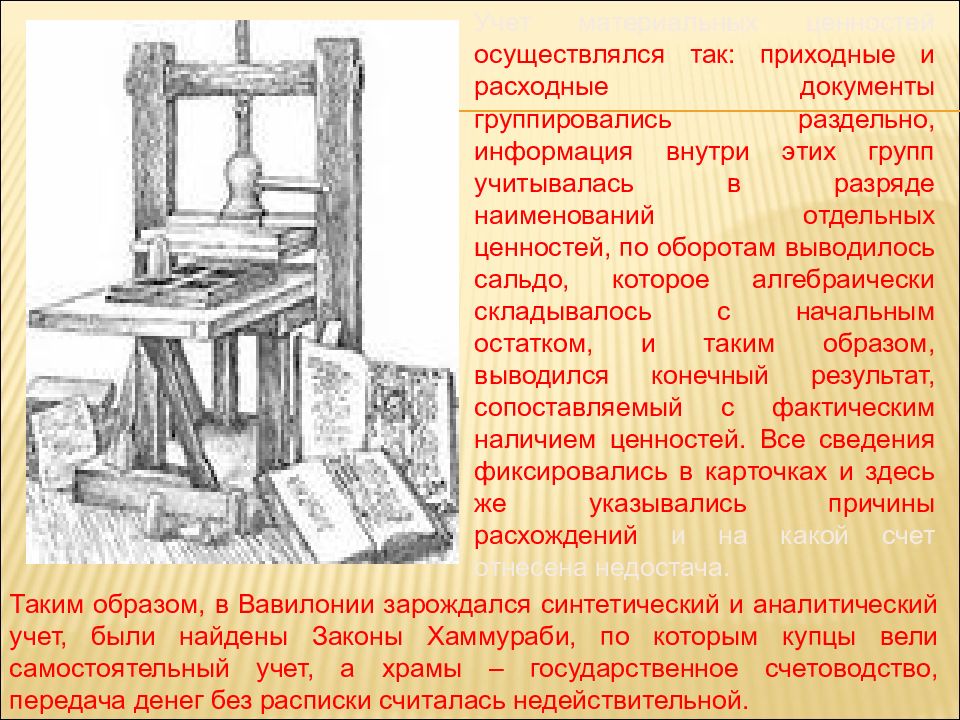 Учет материальных ценностей осуществлялся так: приходные и расходные документы группировались раздельно, информация внутри этих групп учитывалась в разряде наименований отдельных ценностей, по оборотам выводилось сальдо, которое алгебраически складывалось с начальным остатком, и таким образом, выводился конечный результат, сопоставляемый с фактическим наличием ценностей. Все сведения фиксировались в карточках и здесь же указывались причины расхождений и на какой счет отнесена недостача. Таким образом, в Вавилонии зарождался синтетический и аналитический учет, были найдены Законы Хаммураби, по которым купцы вели самостоятельный учет, а храмы – государственное счетоводство, передача денег без расписки считалась недействительной.