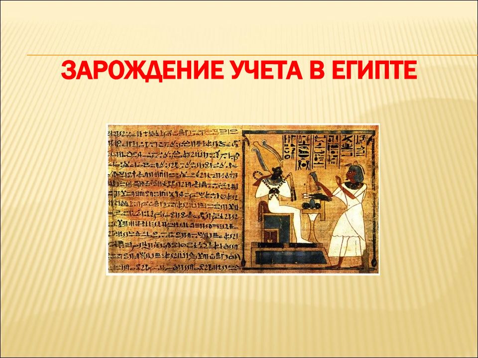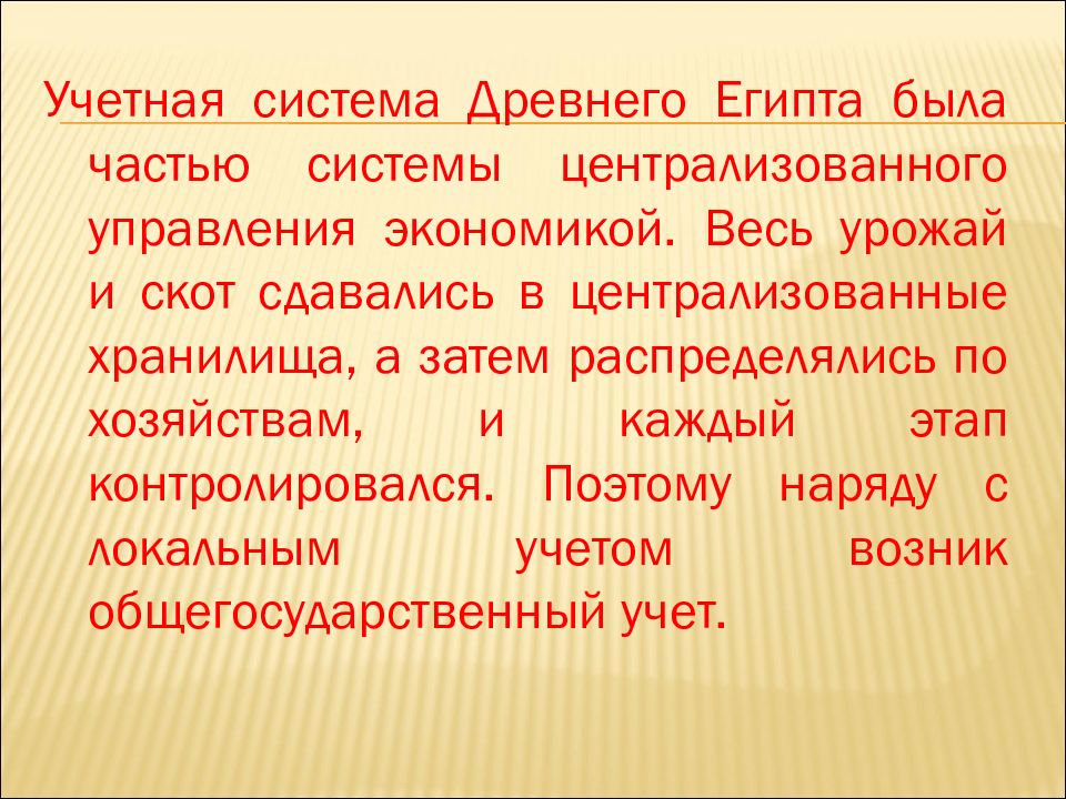 Учетная система Древнего Египта была частью системы централизованного управления экономикой. Весь урожай и скот сдавались в централизованные хранилища, а затем распределялись по хозяйствам, и каждый этап контролировался. Поэтому наряду с локальным учетом возник общегосударственный учет.
