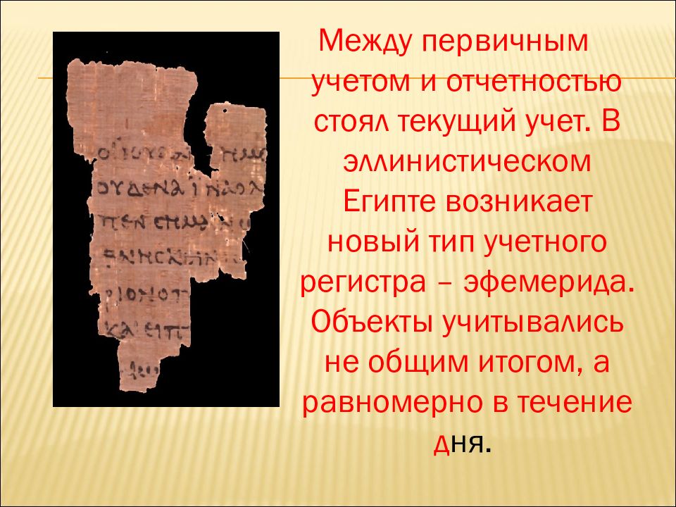 Между первичным учетом и отчетностью стоял текущий учет. В эллинистическом Египте возникает новый тип учетного регистра – эфемерида. Объекты учитывались не общим итогом, а равномерно в течение д ня.