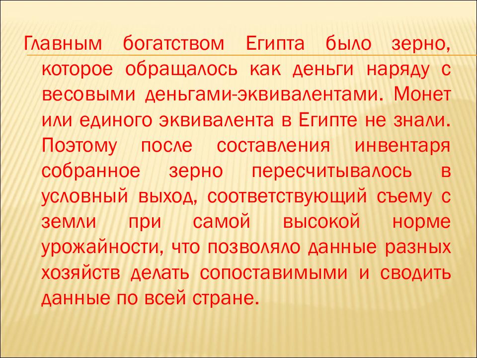 Главным богатством Египта было зерно, которое обращалось как деньги наряду с весовыми деньгами-эквивалентами. Монет или единого эквивалента в Египте не знали. Поэтому после составления инвентаря собранное зерно пересчитывалось в условный выход, соответствующий съему с земли при самой высокой норме урожайности, что позволяло данные разных хозяйств делать сопоставимыми и сводить данные по всей стране.