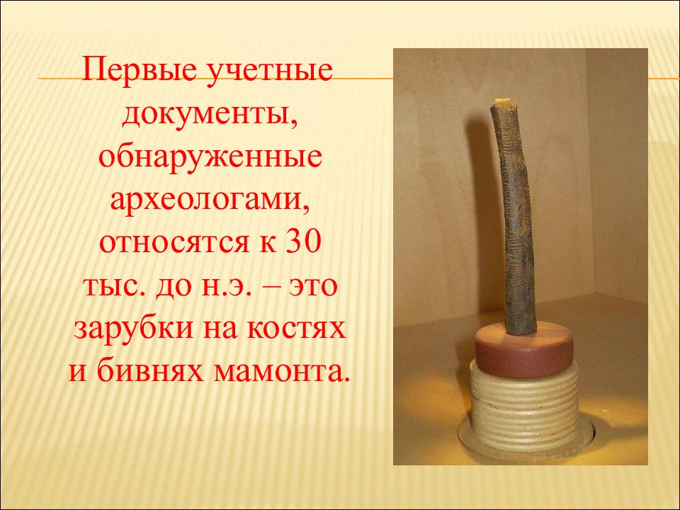 Первые учетные документы, обнаруженные археологами, относятся к 30 тыс. до н.э. – это зарубки на костях и бивнях мамонта.