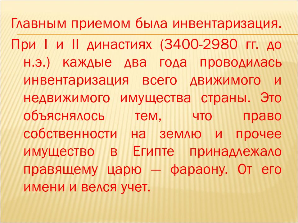 Главным приемом была инвентаризация. При I и II династиях (3400-2980 гг. до н.э.) каждые два года проводилась инвентаризация всего движимого и недвижимого имущества страны. Это объяснялось тем, что право собственности на землю и прочее имущество в Египте принадлежало правящему царю — фараону. От его имени и велся учет.
