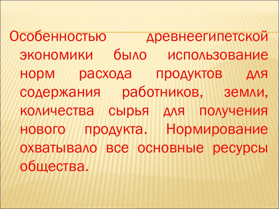 Особенностью древнеегипетской экономики было использование норм расхода продуктов для содержания работников, земли, количества сырья для получения нового продукта. Нормирование охватывало все основные ресурсы общества.