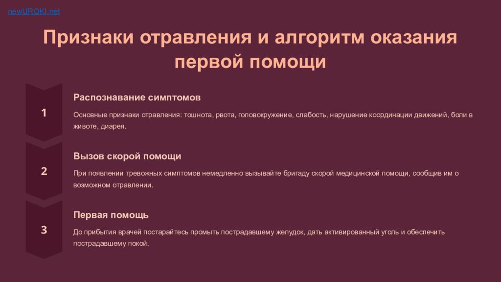Признаки отравления и алгоритм оказания первой помощи Распознавание симптомов Основные признаки отравления: тошнота, рвота, головокружение, слабость, нарушение координации движений, боли в животе, диарея. Вызов скорой помощи При появлении тревожных симптомов немедленно вызывайте бригаду скорой медицинской помощи, сообщив им о возможном отравлении. Первая помощь До прибытия врачей постарайтесь промыть пострадавшему желудок, дать активированный уголь и обеспечить пострадавшему покой. newUROKI.net