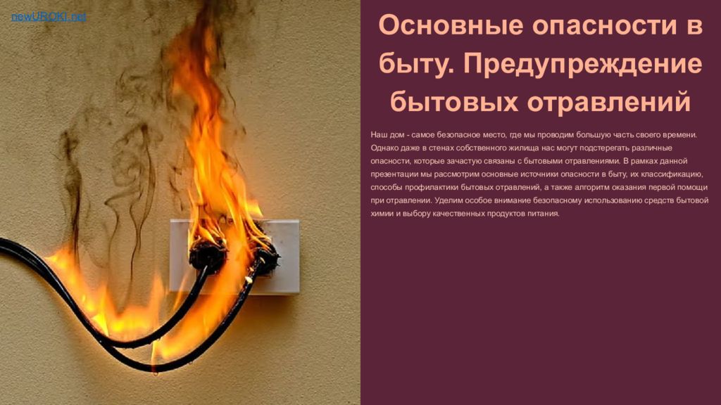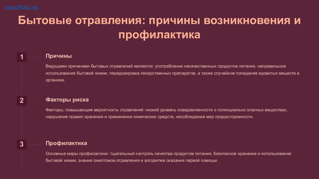 Основные опасности в быту. Предупреждение бытовых отравлений Наш дом - самое безопасное место, где мы проводим большую часть своего времени. Однако даже в стенах собственного жилища нас могут подстерегать различные опасности, которые зачастую связаны с бытовыми отравлениями. В рамках данной презентации мы рассмотрим основные источники опасности в быту, их классификацию, способы профилактики бытовых отравлений, а также алгоритм оказания первой помощи при отравлении. Уделим особое внимание безопасному использованию средств бытовой химии и выбору качественных продуктов питания. newUROKI.net