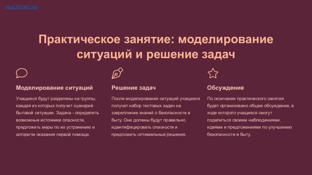 Практическое занятие: моделирование ситуаций и решение задач Моделирование ситуаций Учащиеся будут разделены на группы, каждая из которых получит сценарий бытовой ситуации. Задача - определить возможные источники опасности, предложить меры по их устранению и алгоритм оказания первой помощи. Решение задач После моделирования ситуаций учащиеся получат набор тестовых задач на закрепление знаний о безопасности в быту. Они должны будут правильно идентифицировать опасности и предложить оптимальные решения. Обсуждение По окончании практического занятия будет организовано общее обсуждение, в ходе которого учащиеся смогут поделиться своими наблюдениями, идеями и предложениями по улучшению безопасности в быту. newUROKI.net