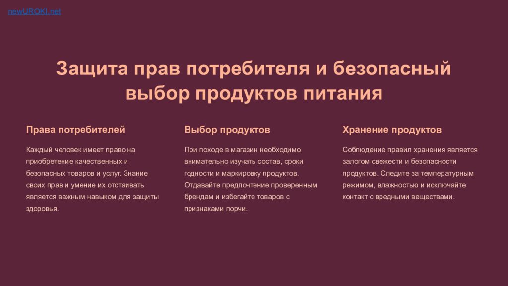 Защита прав потребителя и безопасный выбор продуктов питания Права потребителей Каждый человек имеет право на приобретение качественных и безопасных товаров и услуг. Знание своих прав и умение их отстаивать является важным навыком для защиты здоровья. Выбор продуктов При походе в магазин необходимо внимательно изучать состав, сроки годности и маркировку продуктов. Отдавайте предпочтение проверенным брендам и избегайте товаров с признаками порчи. Хранение продуктов Соблюдение правил хранения является залогом свежести и безопасности продуктов. Следите за температурным режимом, влажностью и исключайте контакт с вредными веществами. newUROKI.net