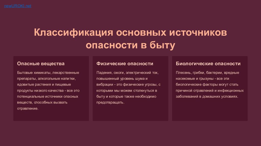 Классификация основных источников опасности в быту Опасные вещества Бытовые химикаты, лекарственные препараты, алкогольные напитки, ядовитые растения и пищевые продукты низкого качества - все это потенциальные источники опасных веществ, способных вызвать отравление. Физические опасности Падения, ожоги, электрический ток, повышенный уровень шума и вибрации - это физические угрозы, с которыми мы можем столкнуться в быту и которые также необходимо предотвращать. Биологические опасности Плесень, грибки, бактерии, вредные насекомые и грызуны - все эти биологические факторы могут стать причиной отравлений и инфекционных заболеваний в домашних условиях. newUROKI.net