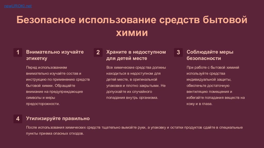 Безопасное использование средств бытовой химии 1 Внимательно изучайте этикетку Перед использованием внимательно изучайте состав и инструкцию по применению средств бытовой химии. Обращайте внимание на предупреждающие символы и меры предосторожности. 2 Храните в недоступном для детей месте Все химические средства должны находиться в недоступном для детей месте, в оригинальной упаковке и плотно закрытыми. Не допускайте их случайного попадания внутрь организма. 3 Соблюдайте меры безопасности При работе с бытовой химией используйте средства индивидуальной защиты, обеспечьте достаточную вентиляцию помещения и избегайте попадания веществ на кожу и в глаза. 4 Утилизируйте правильно После использования химических средств тщательно вымойте руки, а упаковку и остатки продуктов сдайте в специальные пункты приема опасных отходов. newUROKI.net