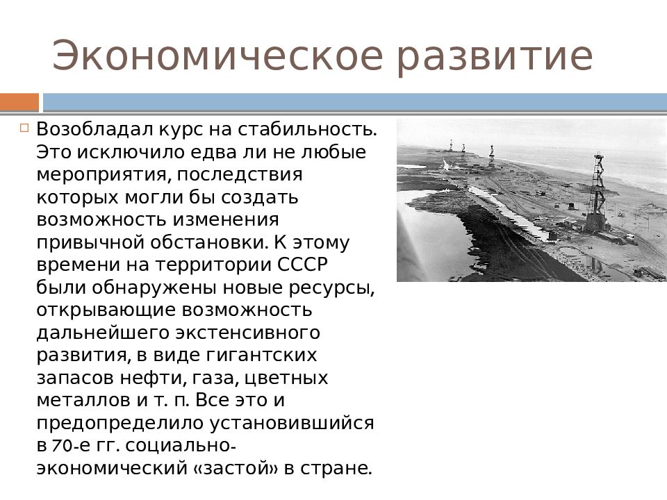 Возобладал курс на стабильность. Это исключило едва ли не любые мероприятия, последствия которых могли бы создать возможность изменения привычной обстановки. К этому времени на территории СССР были обнаружены новые ресурсы, открывающие возможность дальнейшего экстенсивного развития, в виде гигантских запасов нефти, газа, цветных металлов и т. п. Все это и предопределило установившийся в 70-е гг. социально-экономический «застой» в стране.