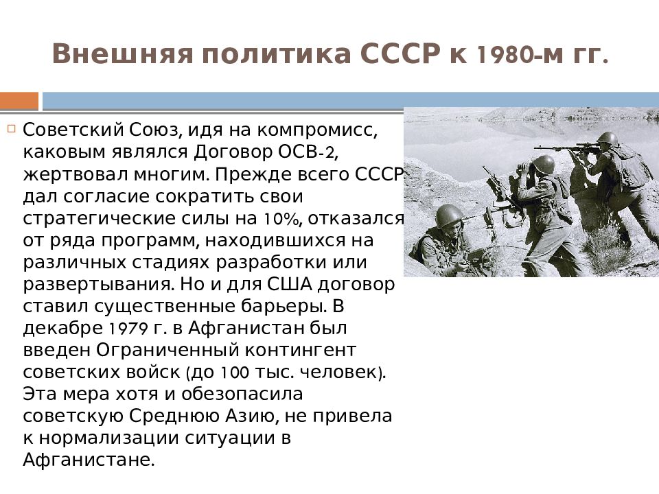 Советский Союз, идя на компромисс, каковым являлся Договор ОСВ-2, жертвовал многим. Прежде всего СССР дал согласие сократить свои стратегические силы на 10%, отказался от ряда программ, находившихся на различных стадиях разработки или развертывания. Но и для США договор ставил существенные барьеры. В декабре 1979 г. в Афганистан был введен Ограниченный контингент советских войск (до 100 тыс. человек). Эта мера хотя и обезопасила советскую Среднюю Азию, не привела к нормализации ситуации в Афганистане.