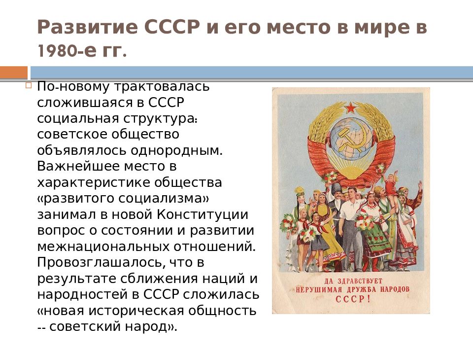 По-новому трактовалась сложившаяся в СССР социальная структура: советское общество объявлялось однородным. Важнейшее место в характеристике общества «развитого социализма» занимал в новой Конституции вопрос о состоянии и развитии межнациональных отношений. Провозглашалось, что в результате сближения наций и народностей в СССР сложилась «новая историческая общность -- советский народ».