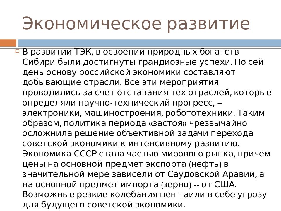 В развитии ТЭК, в освоении природных богатств Сибири были достигнуты грандиозные успехи. По сей день основу российской экономики составляют добывающие отрасли. Все эти мероприятия проводились за счет отставания тех отраслей, которые определяли научно-технический прогресс, -- электроники, машиностроения, робототехники. Таким образом, политика периода «застоя» чрезвычайно осложнила решение объективной задачи перехода советской экономики к интенсивному развитию. Экономика СССР стала частью мирового рынка, причем цены на основной предмет экспорта (нефть) в значительной мере зависели от Саудовской Аравии, а на основной предмет импорта (зерно) -- от США. Возможные резкие колебания цен таили в себе угрозу для будущего советской экономики.
