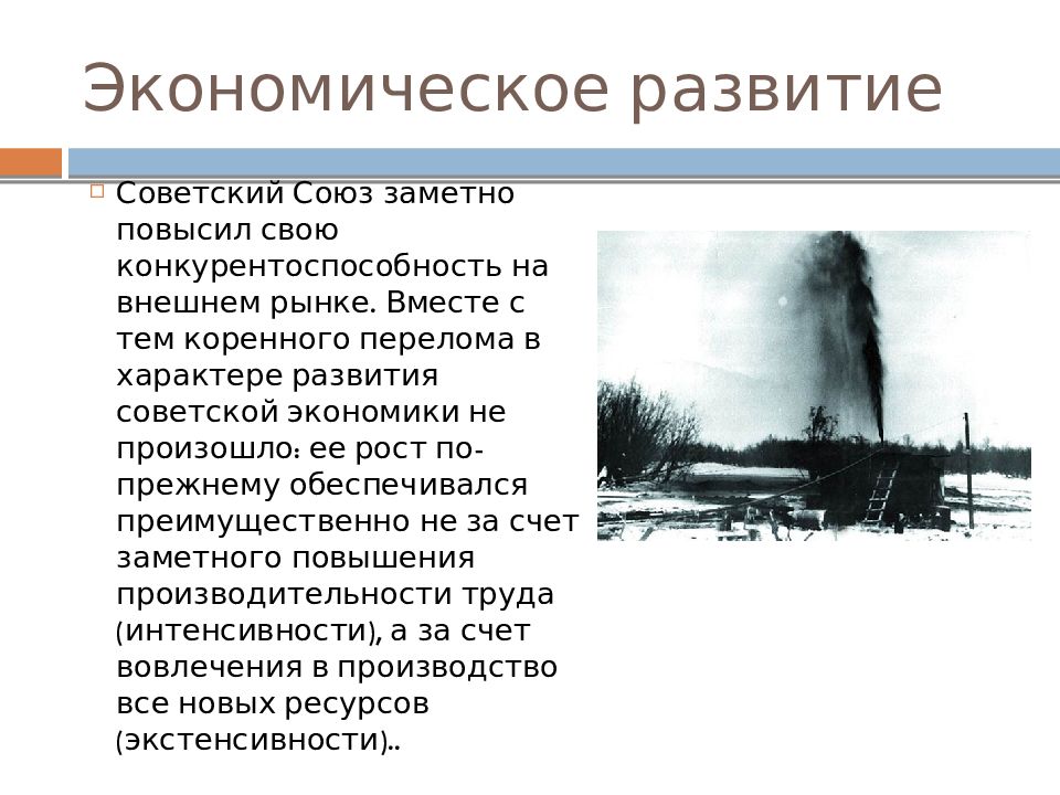 Советский Союз заметно повысил свою конкурентоспособность на внешнем рынке. Вместе с тем коренного перелома в характере развития советской экономики не произошло: ее рост по-прежнему обеспечивался преимущественно не за счет заметного повышения производительности труда (интенсивности), а за счет вовлечения в производство все новых ресурсов (экстенсивности)..