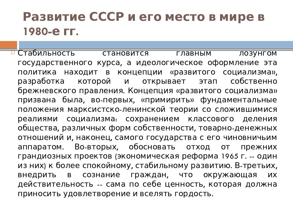 Стабильность становится главным лозунгом государственного курса, а идеологическое оформление эта политика находит в концепции «развитого социализма», разработка которой и открывает этап собственно брежневского правления. Концепция «развитого социализма» призвана была, во-первых, «примирить» фундаментальные положения марксистско-ленинской теории со сложившимися реалиями социализма: сохранением классового деления общества, различных форм собственности, товарно-денежных отношений и, наконец, самого государства с его чиновничьим аппаратом. Во-вторых, обосновать отход от прежних грандиозных проектов (экономическая реформа 1965 г. -- один из них) к более спокойному, стабильному развитию. В-третьих, внедрить в сознание граждан, что окружающая их действительность -- сама по себе ценность, которая должна приносить удовлетворение и вселять гордость.