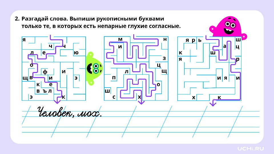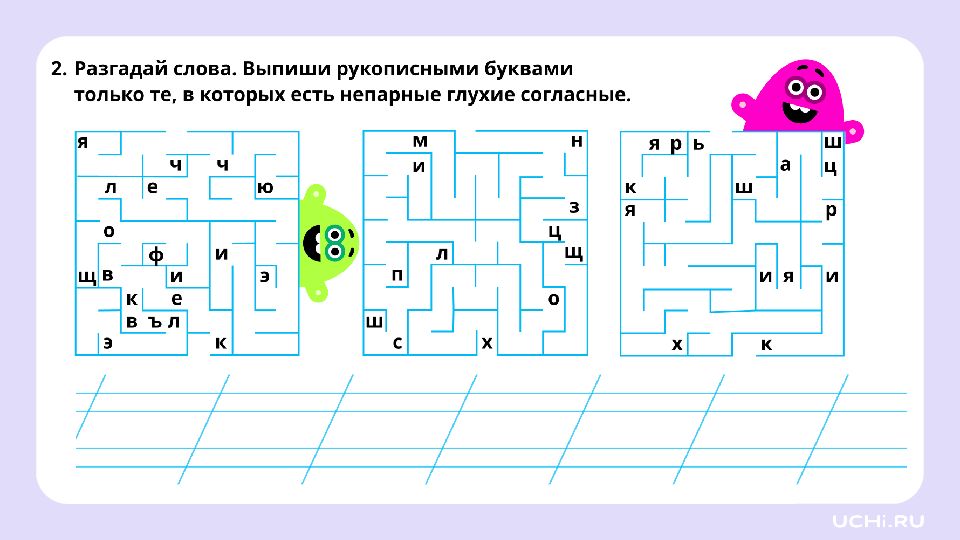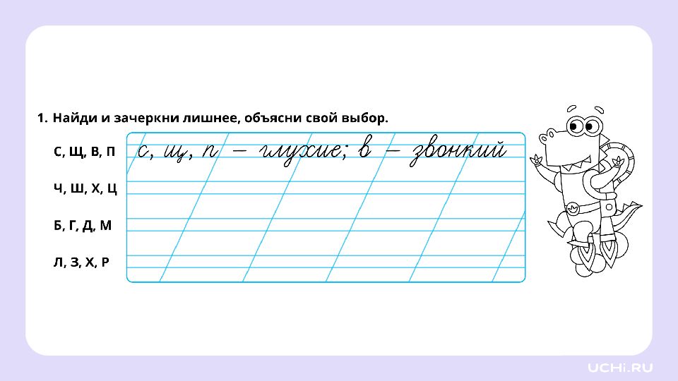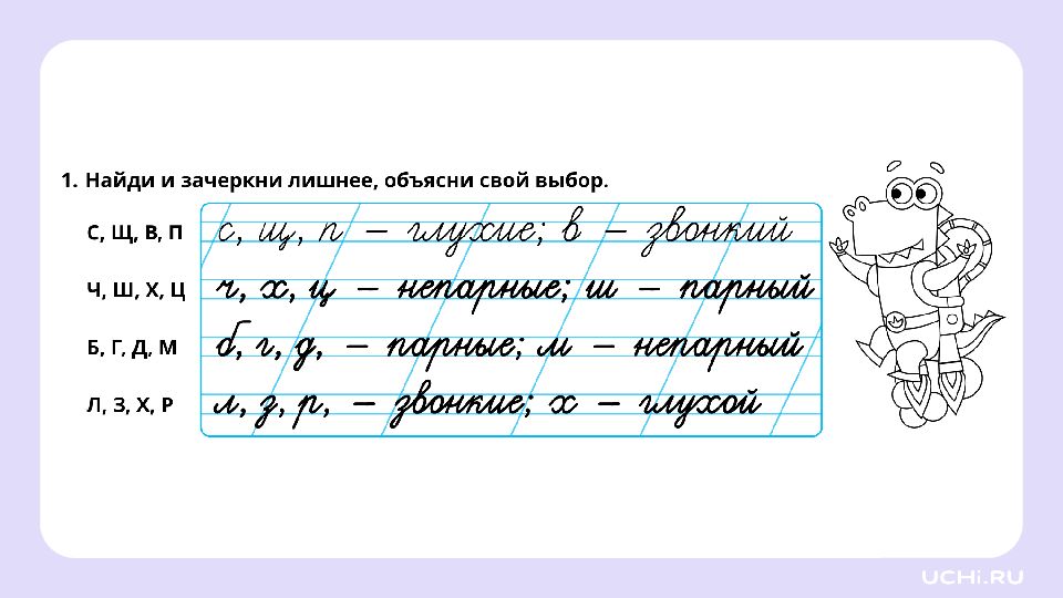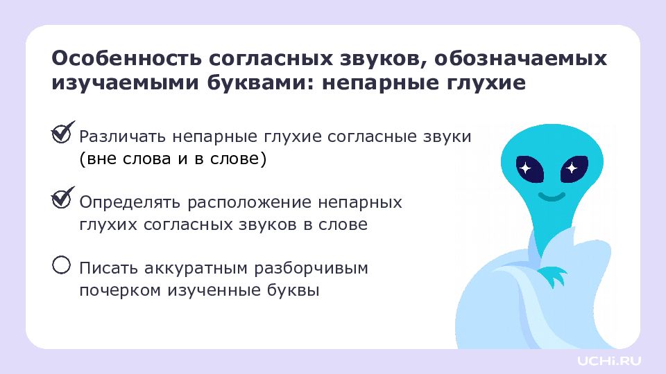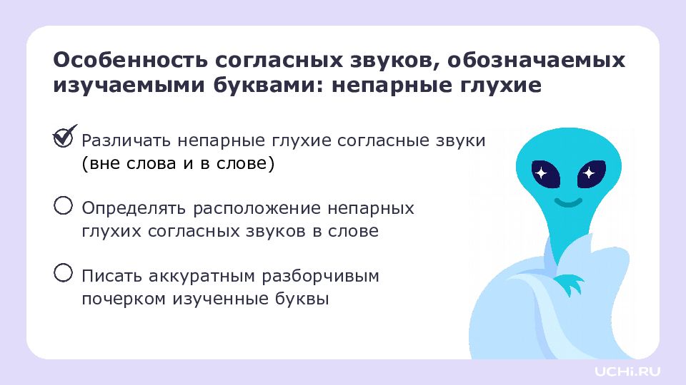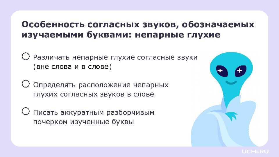 Особенность согласных звуков, обозначаемых изучаемыми буквами: непарные глухие 1 класс