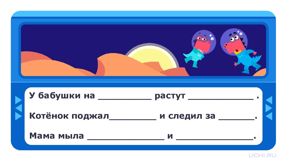 У бабушки на _________ растут ___________. Кот ё нок поджал________ и следил за ____ _ _. Мама мыла _____________ и _________ _ ___.
