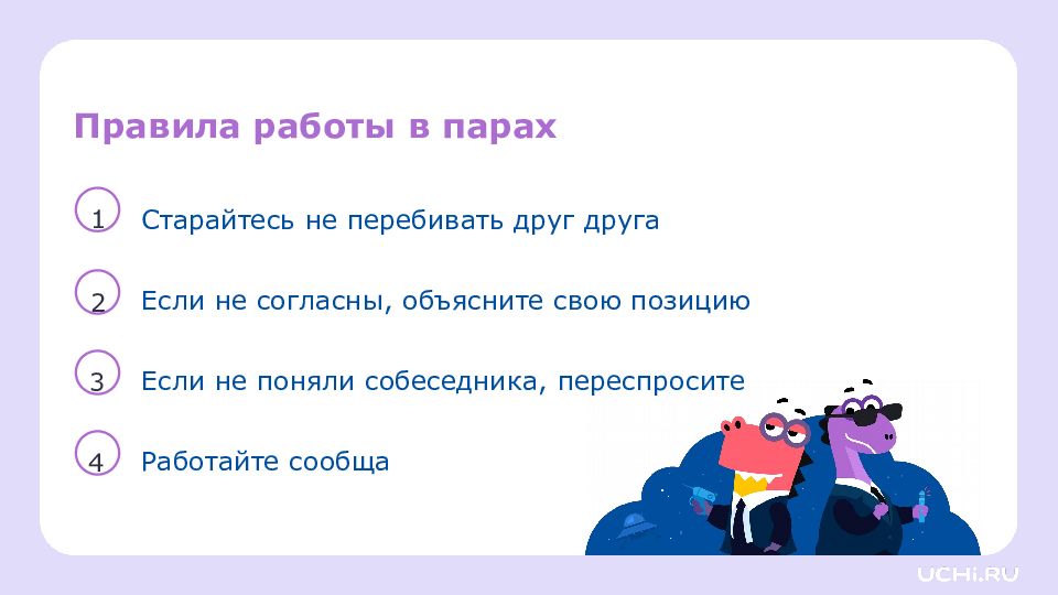 Правила работы в парах 1 2 Если не согласны, объясните свою позицию 3 Если не поняли собеседника, переспросите 4 Работайте сообща Старайтесь не перебивать друг друга