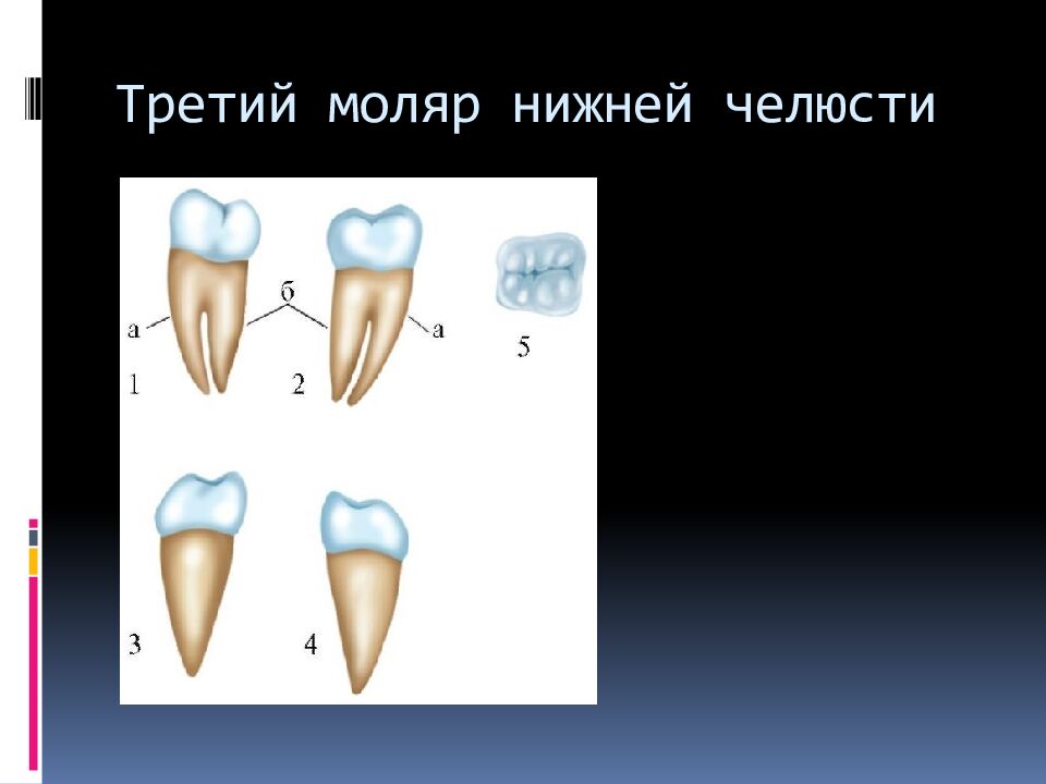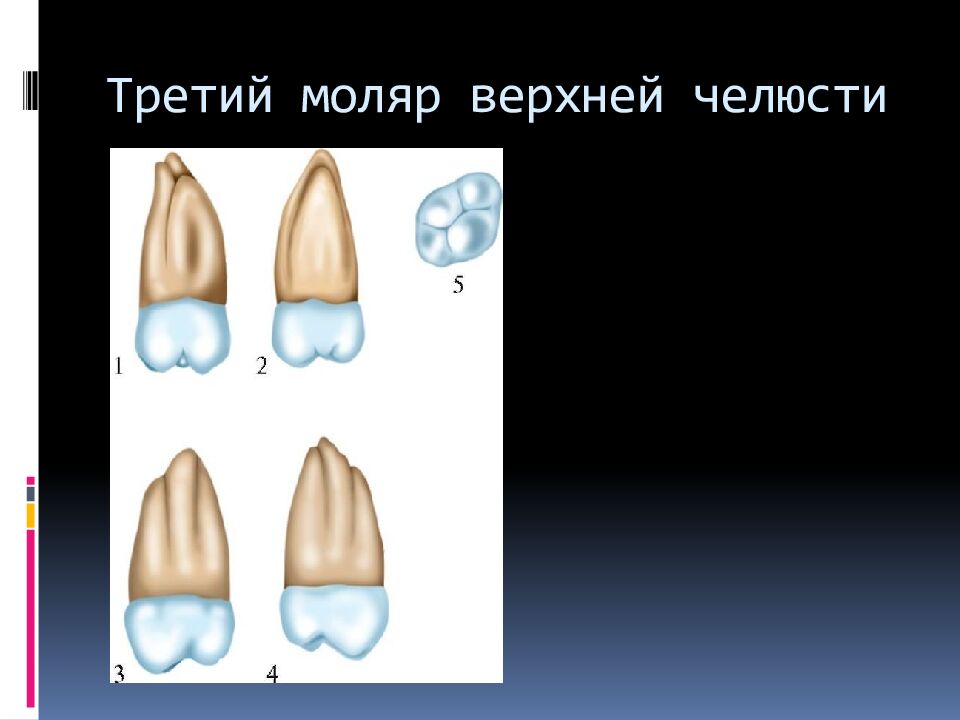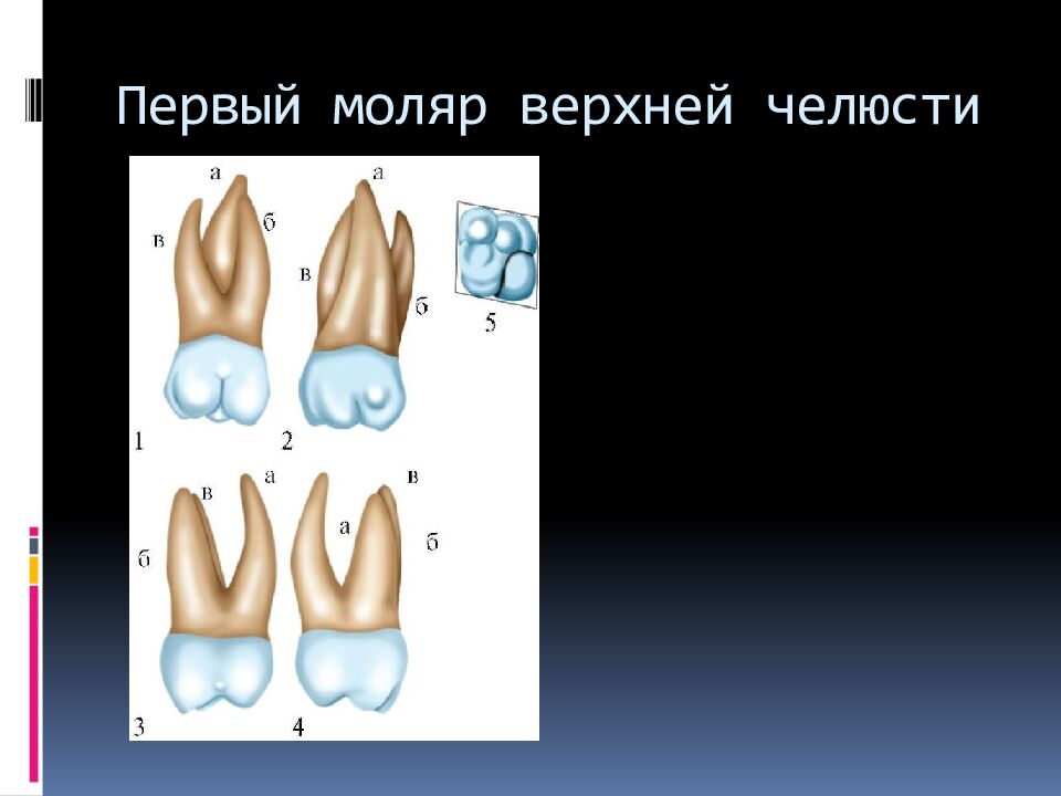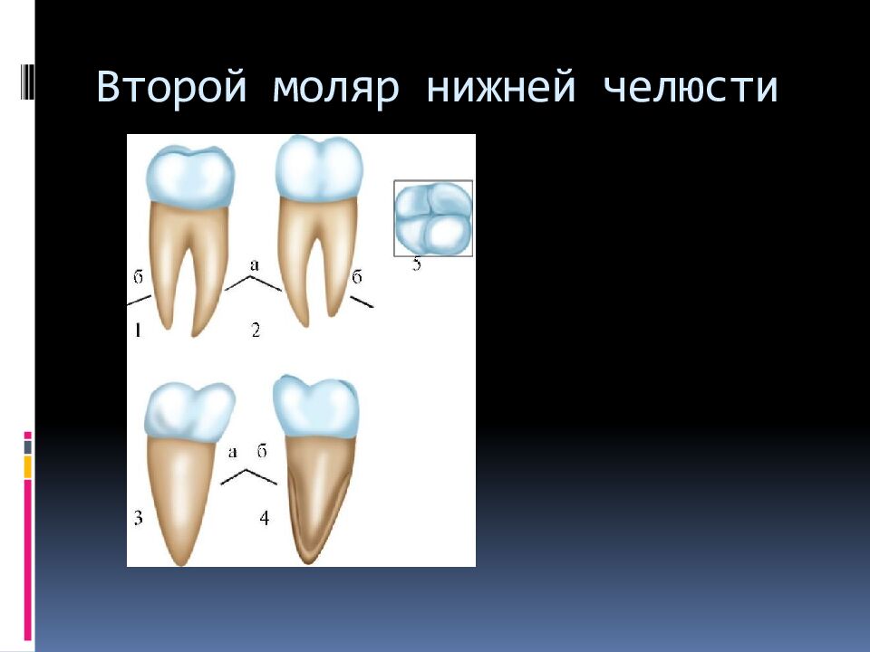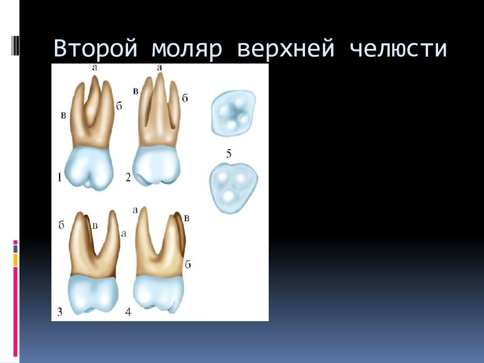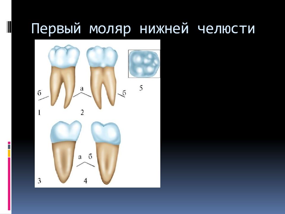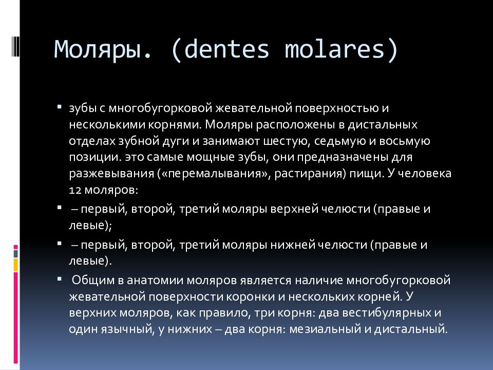 зубы с многобугорковой жевательной поверхностью и несколькими корнями. Моляры расположены в дистальных отделах зубной дуги и занимают шестую, седьмую и восьмую позиции. это самые мощные зубы, они предназначены для разжевывания («перемалывания», растирания) пищи. У человека 12 моляров : – первый, второй, третий моляры верхней челюсти (правые и левые ); – первый, второй, третий моляры нижней челюсти (правые и левые ). Общим в анатомии моляров является наличие многобугорковой жевательной поверхности коронки и нескольких корней. У верхних моляров, как правило, три корня: два вестибулярных и один язычный, у нижних – два корня: мезиальный и дистальный.